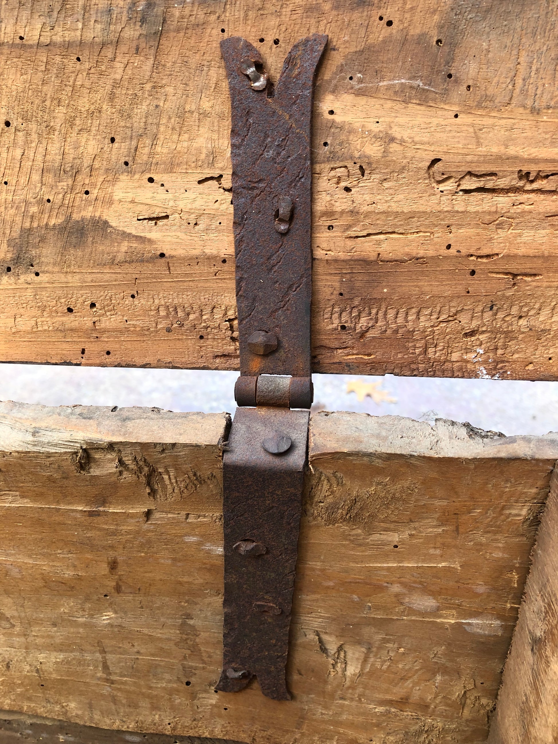 Medieval 17th century European armorial box with coat of arms. It has original old hand hammered hinges with rose head nails. The box is made of mixed woods and has a molded platform and a beaded lift top. The center of the box is inlayed with a family Armorial crest. It is in overall good condition considering its age. It does have scuffs and abrasions in accordance to its age. There are some worm holes but they are not active and have died a long time ago. There is a slight cup to the lid. The dimensions are: